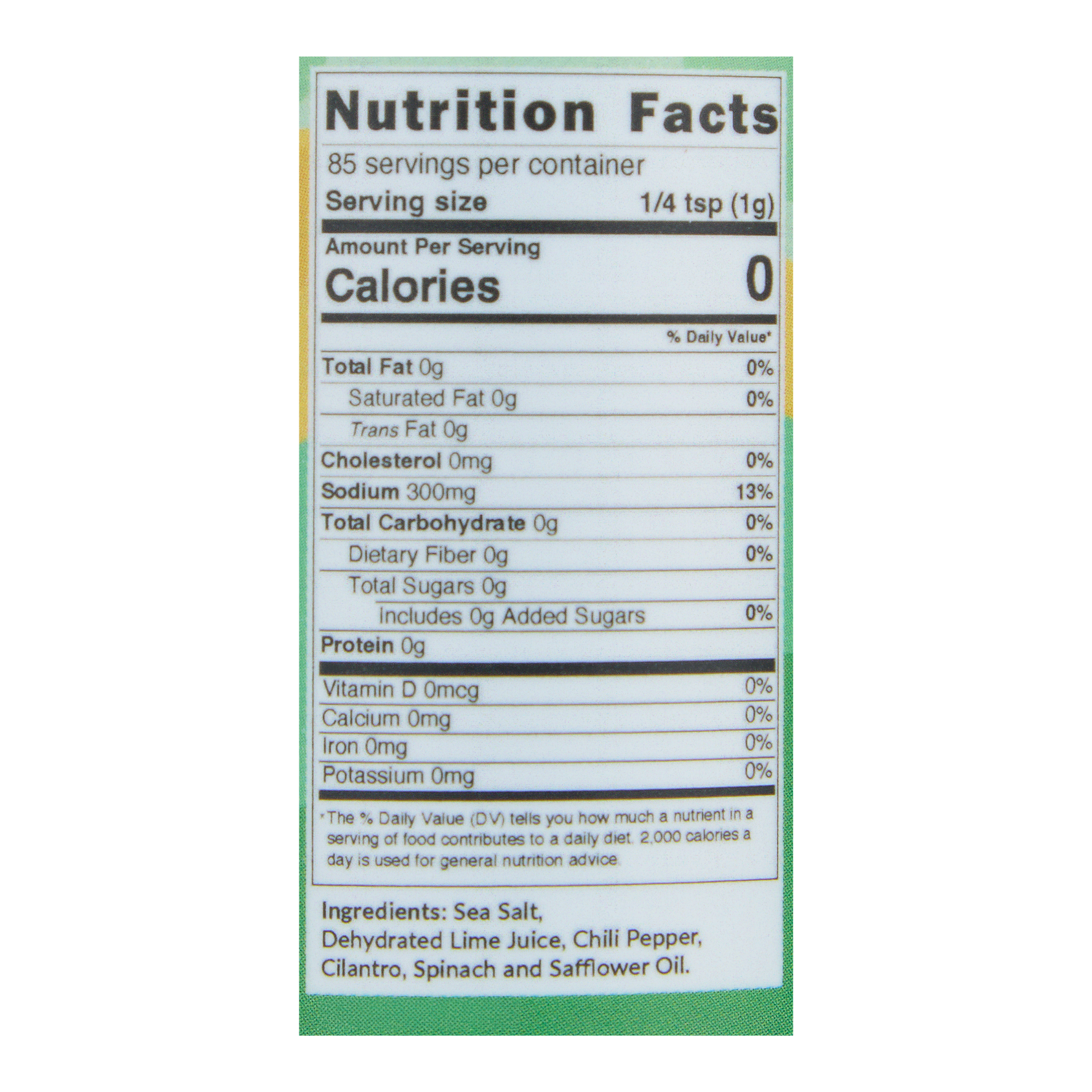 Sea Salt, Dehydrated Lime Juice, Chili Pepper, Cilantro, Spinach and Safflower Oil